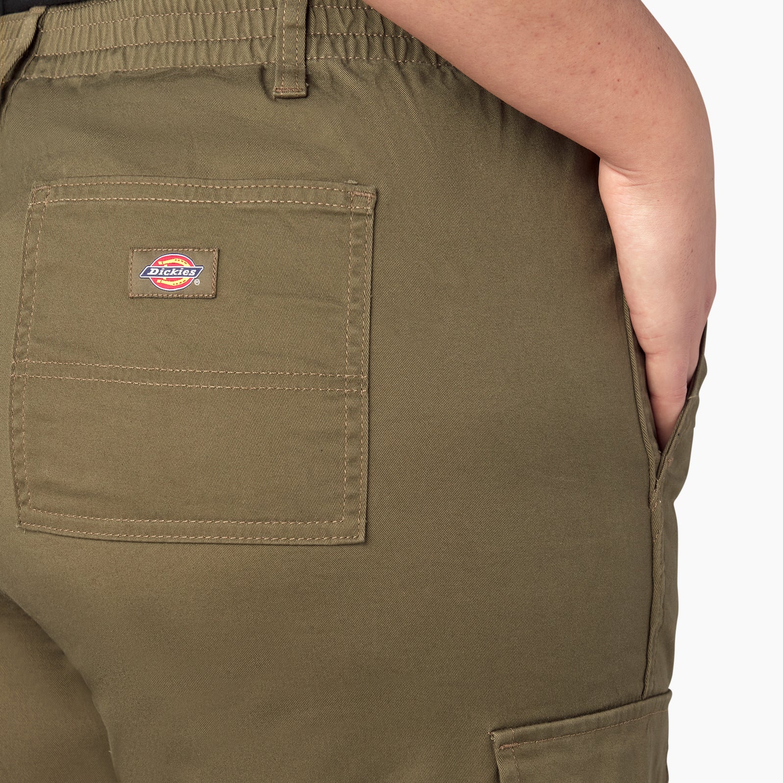 The Dickies Women's Plus High Rise Fit Cargo Jogger Pants have a proper jogger fit, tapering at the ankle, along with plenty of practical pocketing. Elastic along the back waist provides a comfortable custom fit for easy all-day wearability and straightforward styling that works all year round. This simple style has a tack button closure and dual front slash pockets. The high-rise, flat-front cargo pants also feature rear patch pockets and functional dual-side cargo pockets. These pants are good for both the workplace and the weekend.