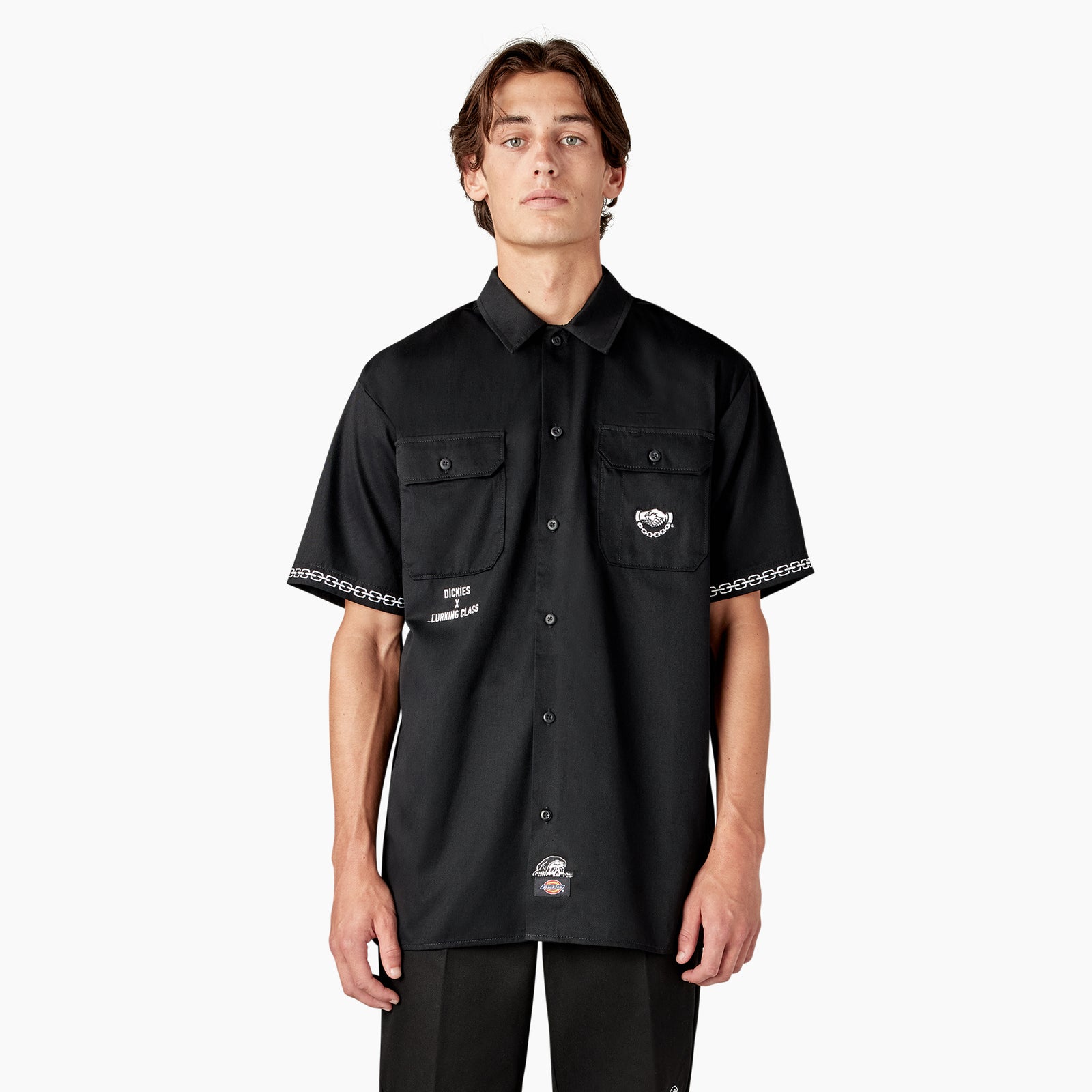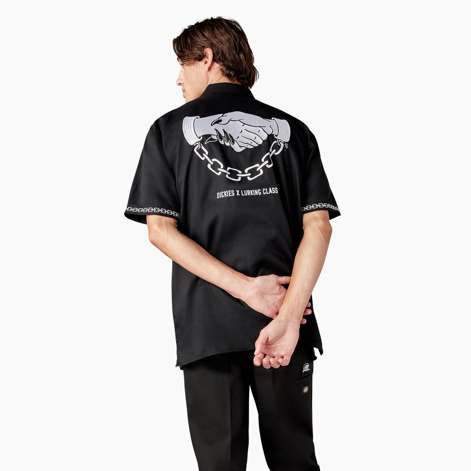 A classic workwear staple is decorated with signature Lurking Class artwork in this Dickies x Lurking Class work shirt. The shirt is crafted from our cotton blend twill fabric and features chain link embroidery at the sleeves, a subtle Down With My Demons graphic at the chest, and the same image embroidered across the back.