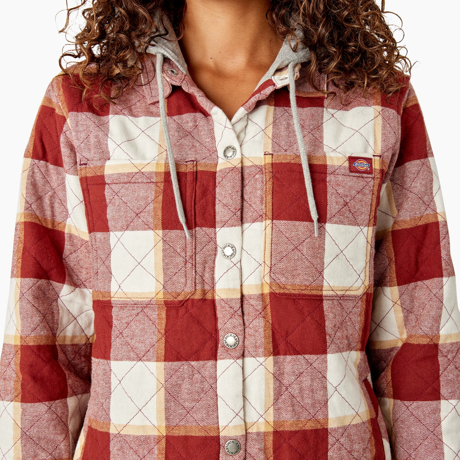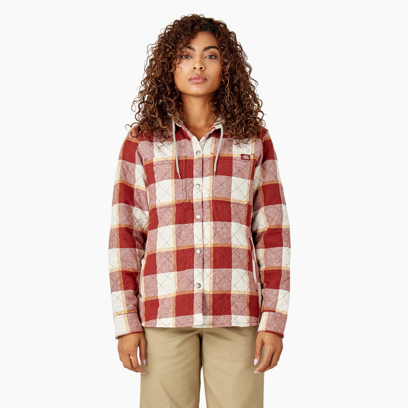 Discover the most versatile outer layer that delivers on the promise of warmth, comfort and protection in Dickies Women’s Flannel Hooded Shirt Jacket. Combining the lived-in feel of a hoodie, the warmth of flannel shirt, and the security of a jacket, this workday essential will check the box for function and style. Featuring a soft flannel fabrication equipped with a cozy jersey lining and hood, you’ll embrace the cold climate with ease in this quilted shirt jacket. You’re covered in wet weather too, as the DWR finish ensures water repellency to keep you dry. Durable metal snap closures at front and a drop tail hem offers even more protection when your work climate calls for it. Maximum utility comes standard with two large chest pockets and two side welt pockets to store all that you carry.