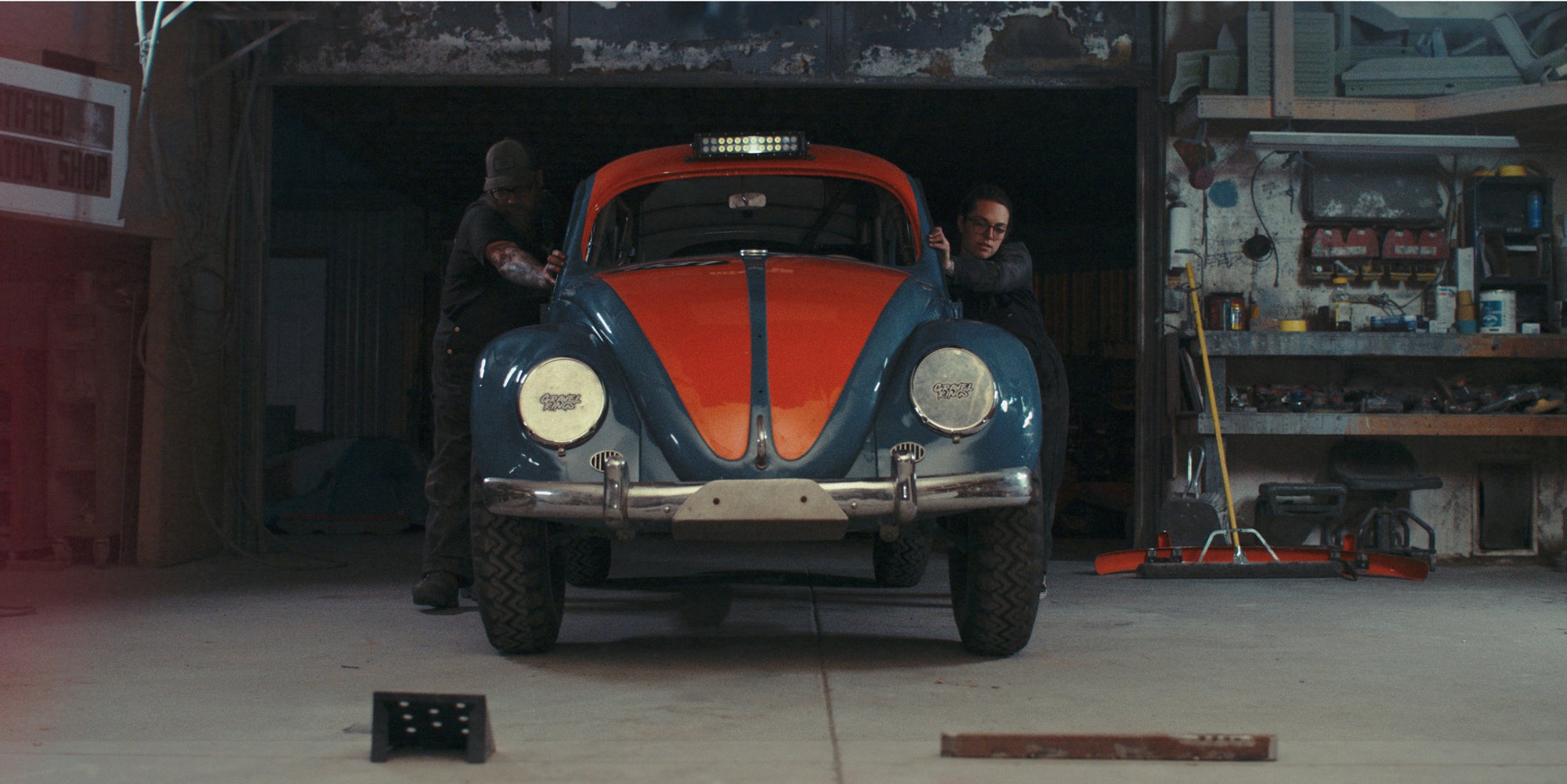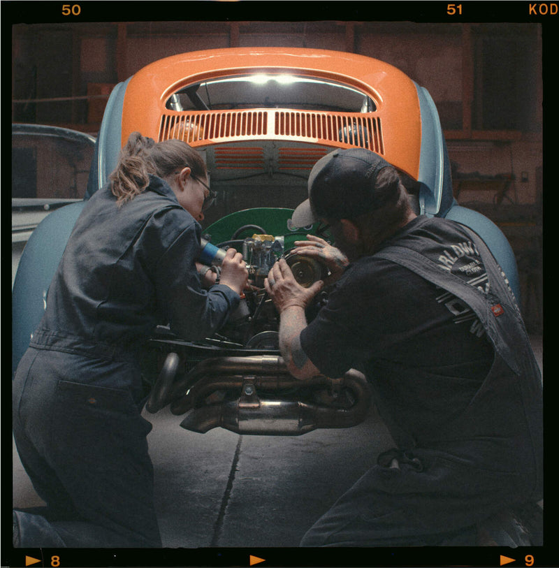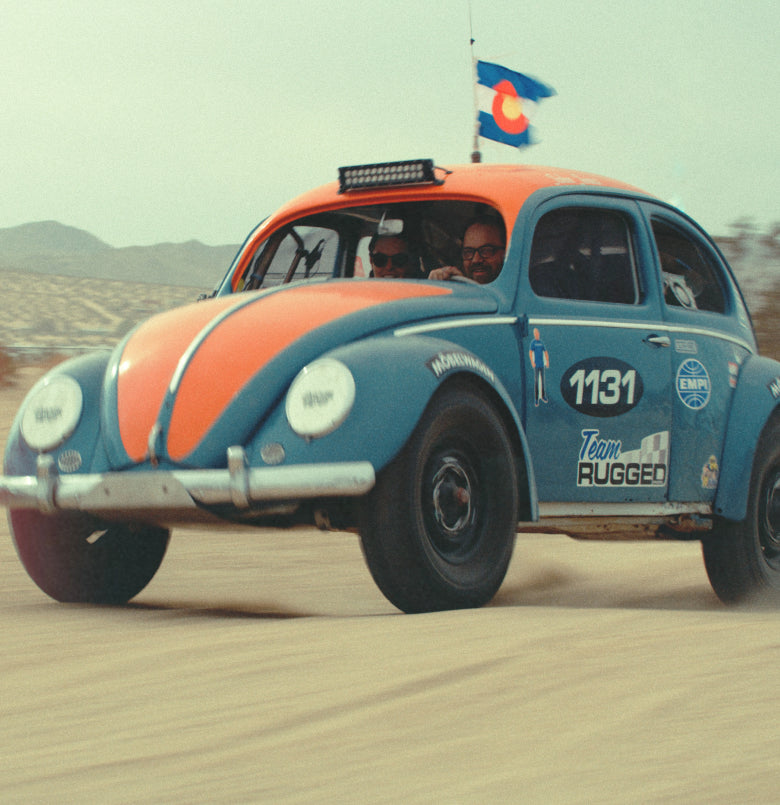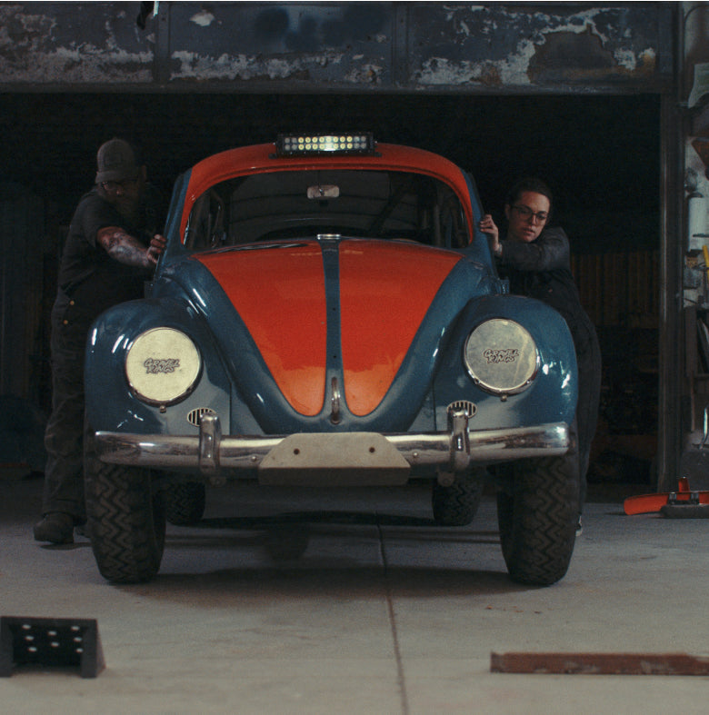 JJ and Audrey spent more than three months getting their build in shape for off-roading in the desert. Then, they loaded up one of their vintage VW buses and set off for Hammertown with the Bug in tow.