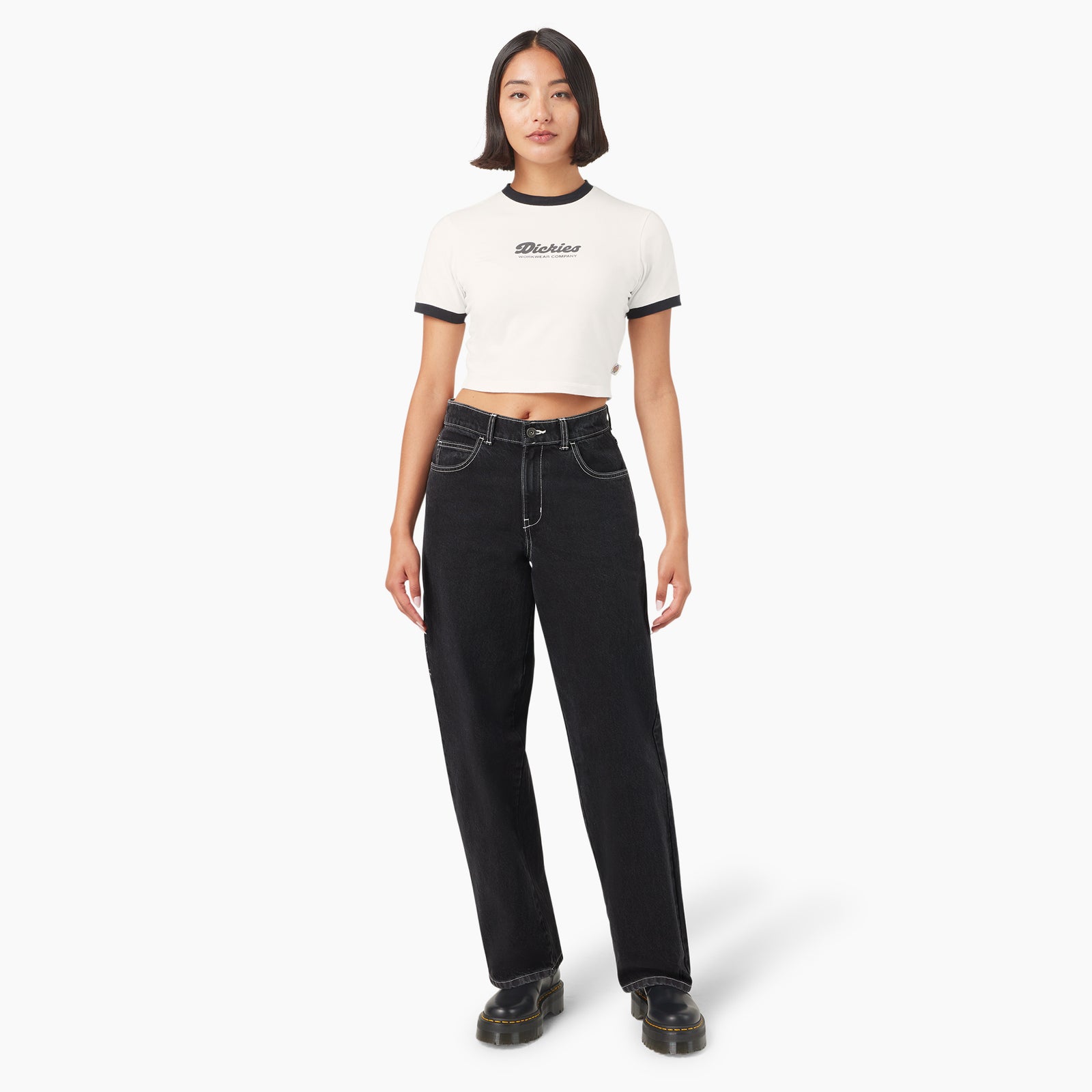 The Lewistown women’s ringer tee features a slim fit, cropped length, and contrasting neck and sleeve ribbing. The t-shirt is crafted from a cotton blend with just enough stretch for comfort. It’s finished with a small script graphic inspired by the Dickies logo for a retro look.