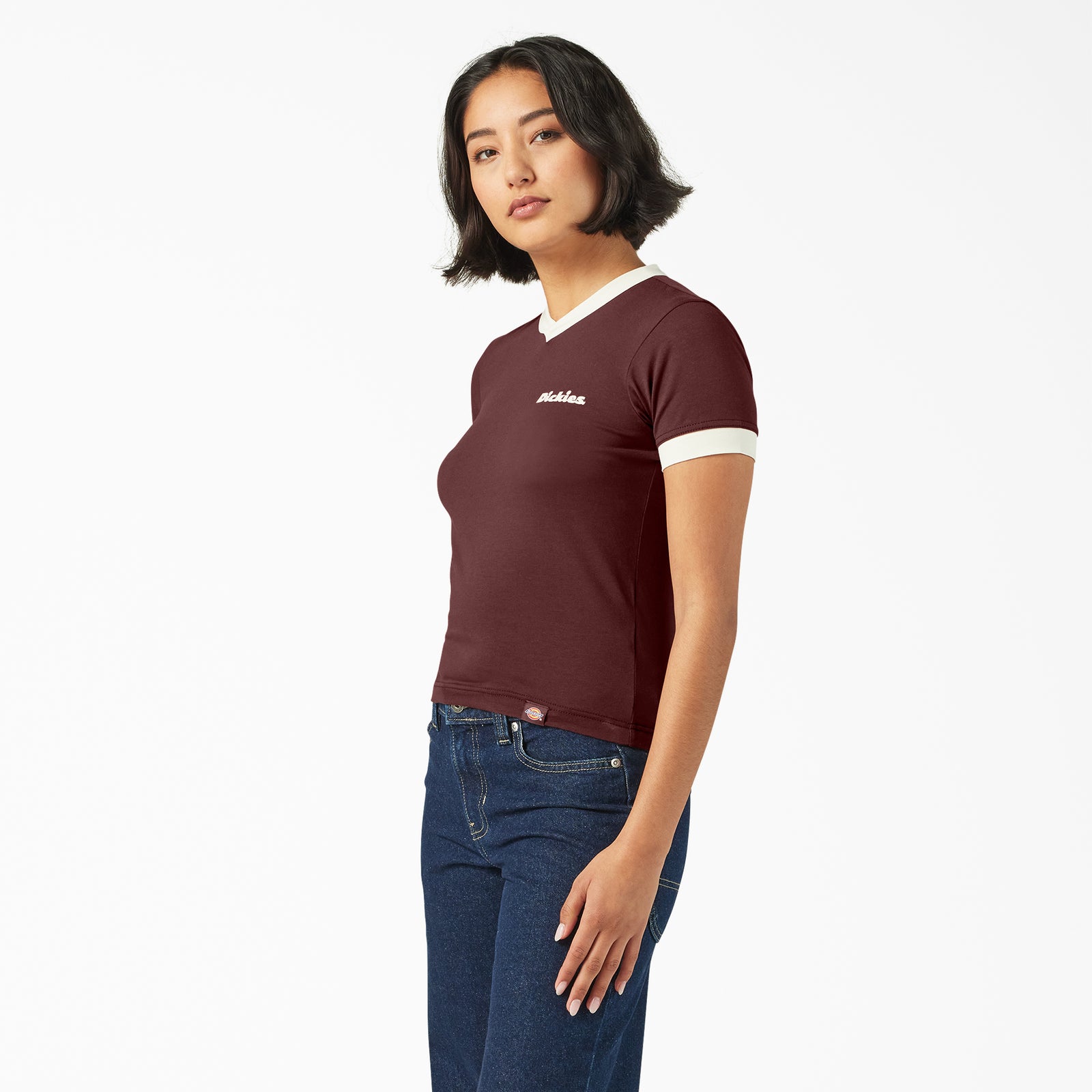 Give your t-shirt rotation a retro update with the Slayden women’s t-shirt. The v-neck tee features a slim fit, cotton-blend jersey fabric with stretch for comfort, contrast neckline and sleeve cuffs, and a subtle script logo on the left chest.