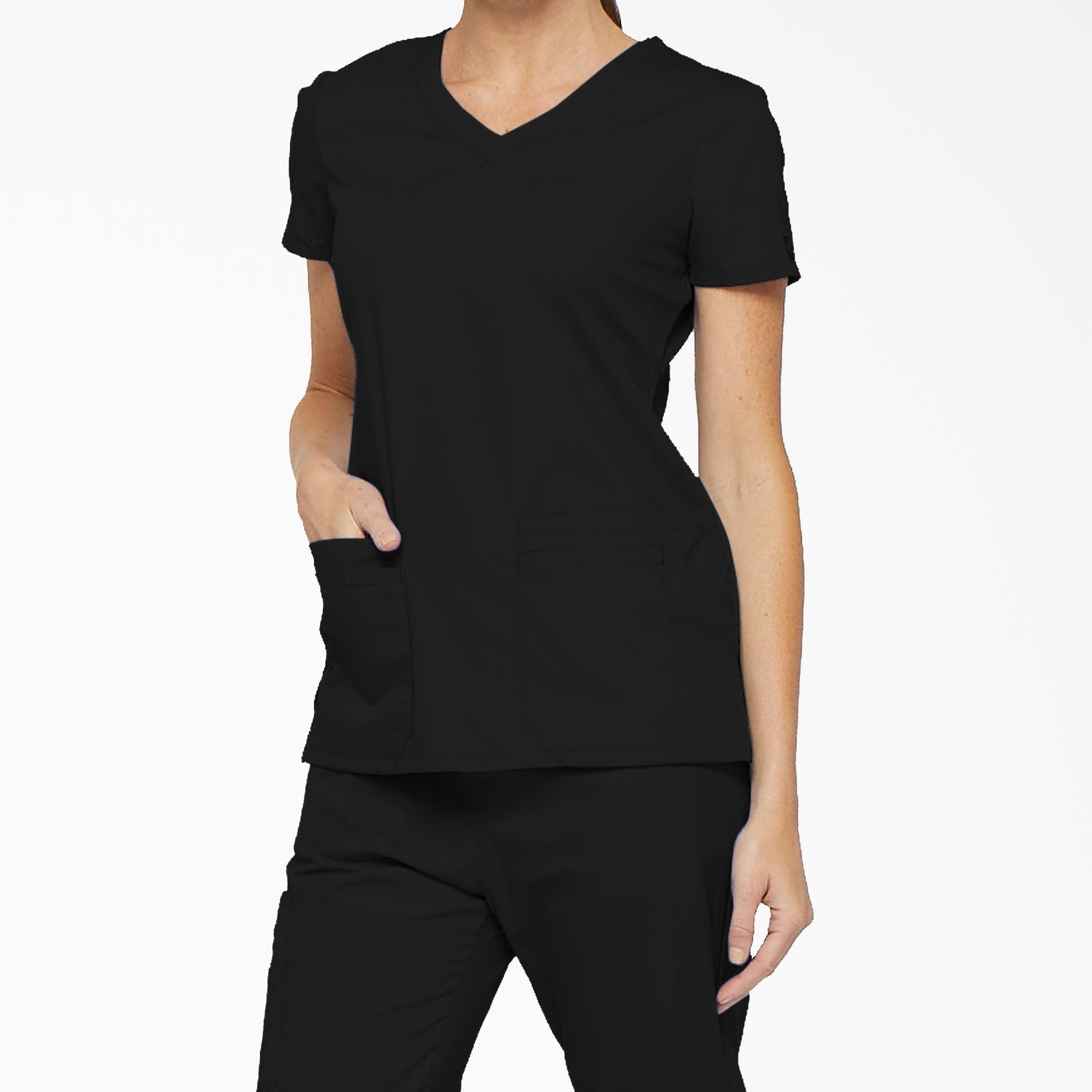 A Contemporary fit, V-neck top features Dickies logo twill tape at the back neck and has an instrument loop on the right pocket. Also featured are multiple patch pockets with pencil slots, back princess seams and side vents.