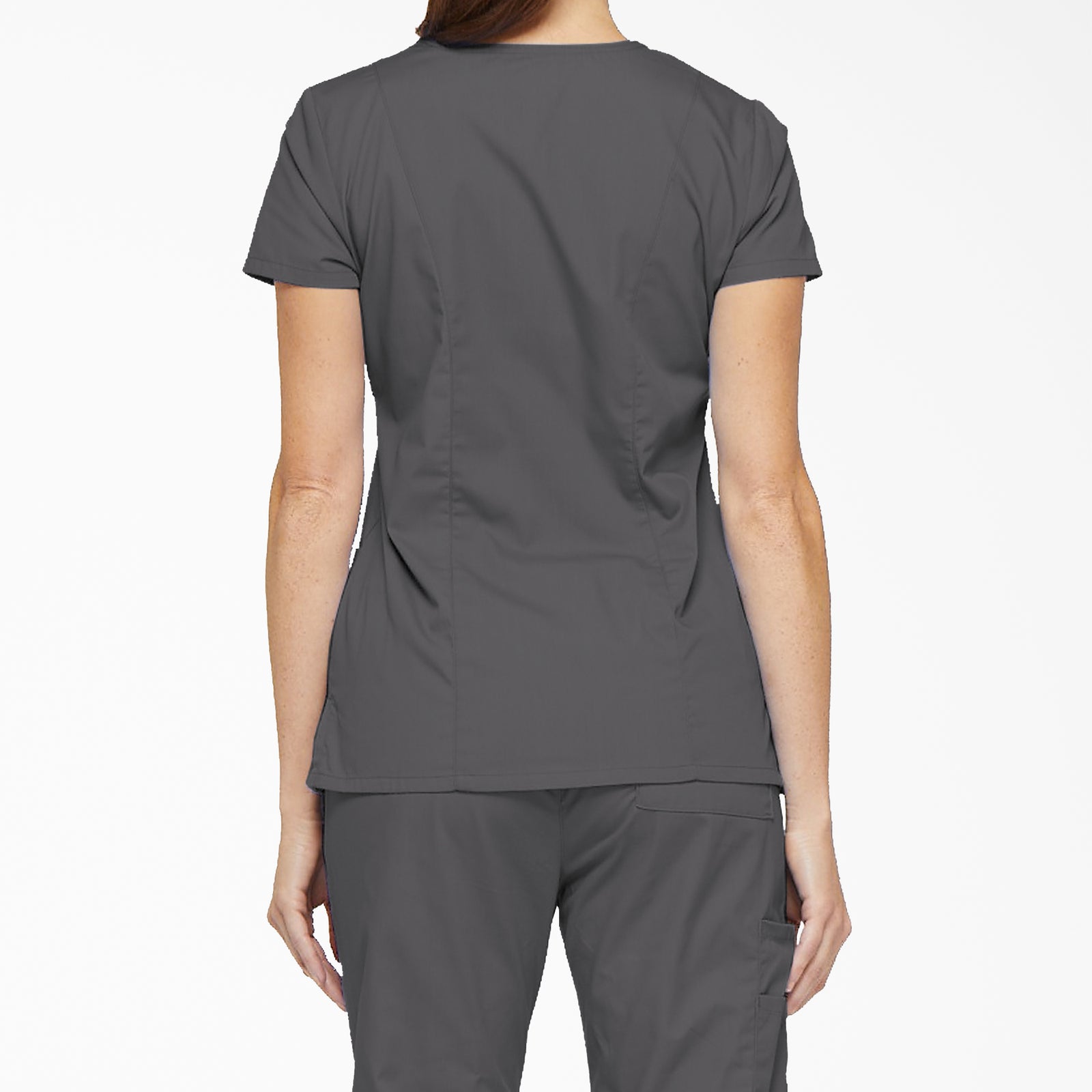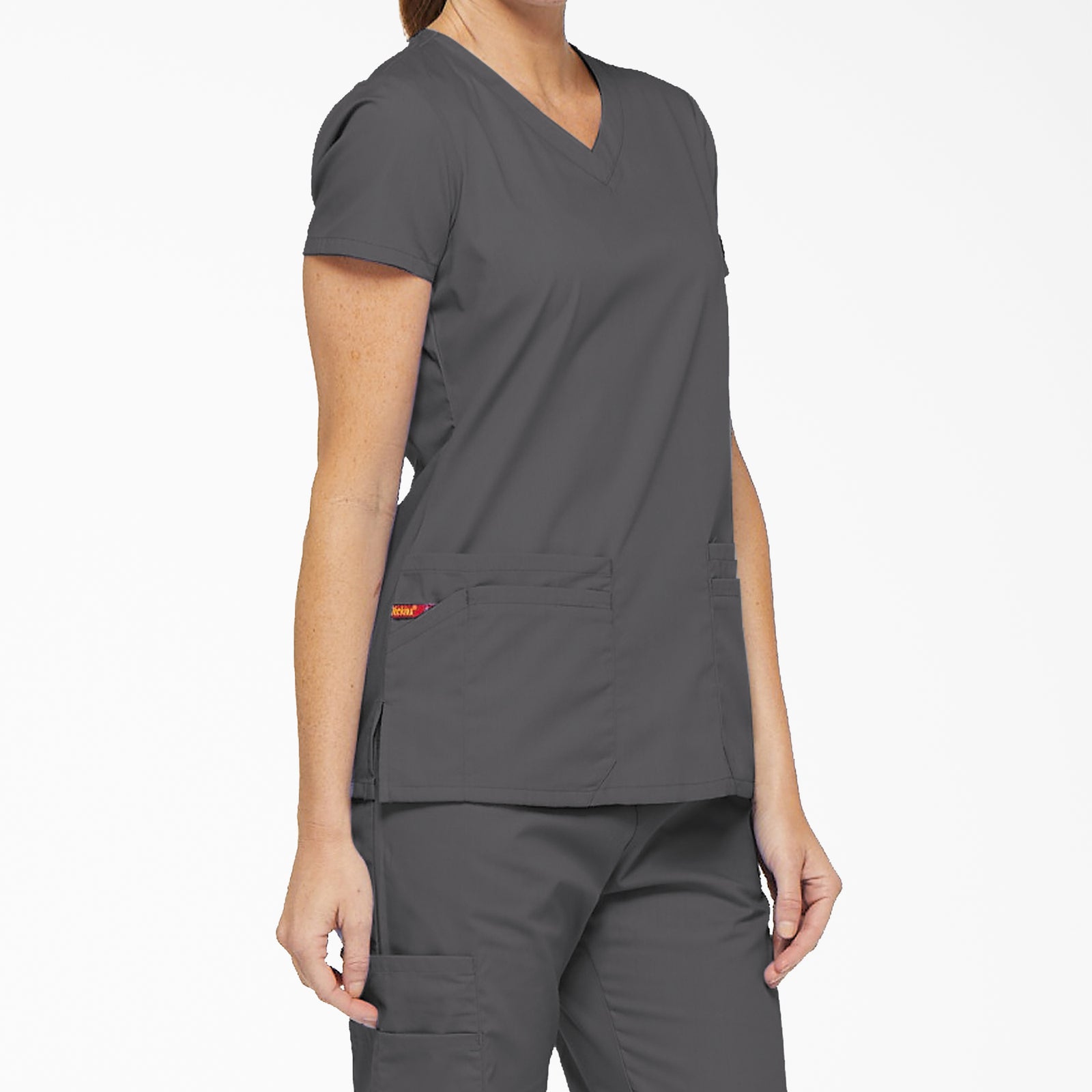 A Contemporary fit, V-neck top features Dickies logo twill tape at the back neck and has an instrument loop on the right pocket. Also featured are multiple patch pockets with pencil slots, back princess seams and side vents.