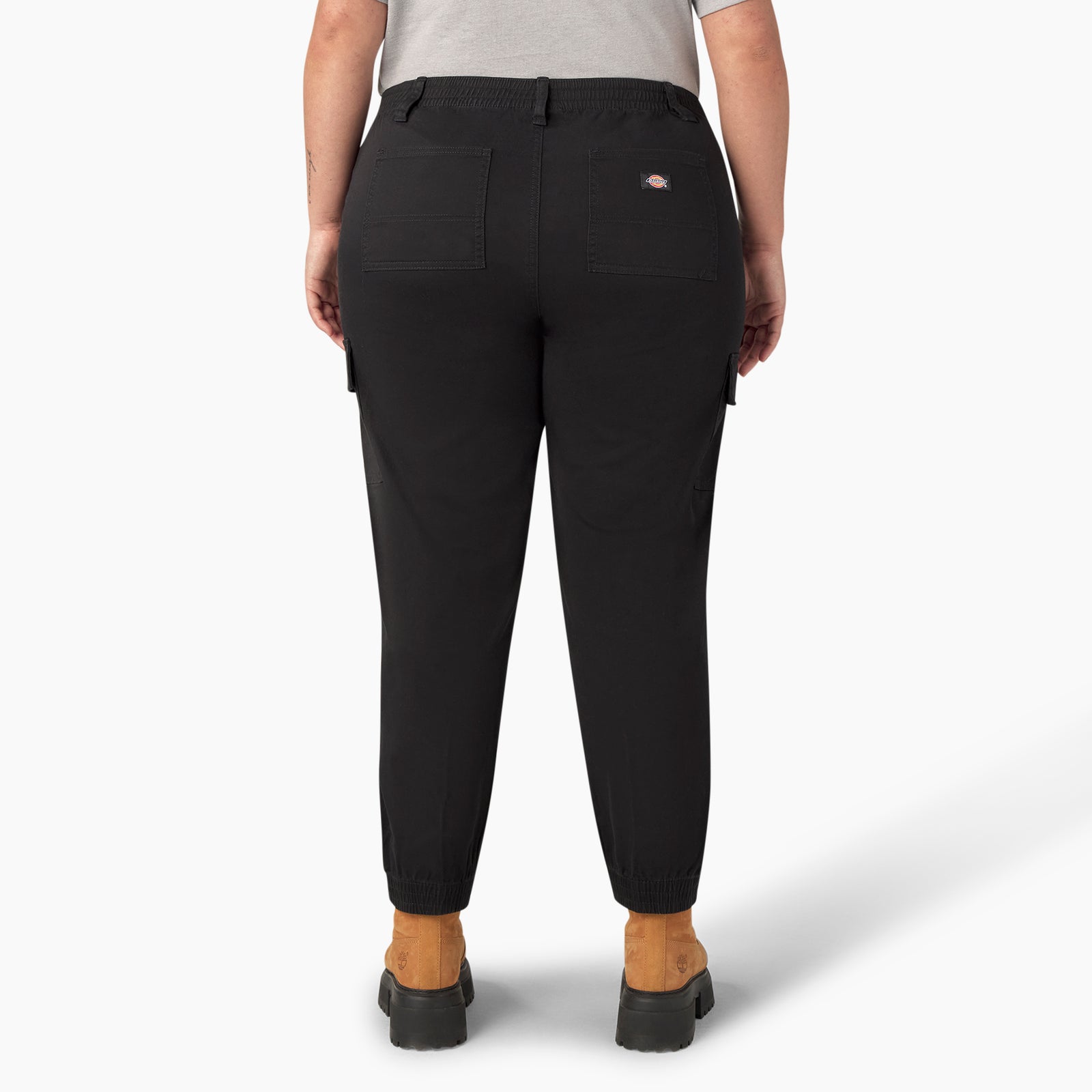 The Dickies Women's Plus High Rise Fit Cargo Jogger Pants have a proper jogger fit, tapering at the ankle, along with plenty of practical pocketing. Elastic along the back waist provides a comfortable custom fit for easy all-day wearability and straightforward styling that works all year round. This simple style has a tack button closure and dual front slash pockets. The high-rise, flat-front cargo pants also feature rear patch pockets and functional dual-side cargo pockets. These pants are good for both the workplace and the weekend.