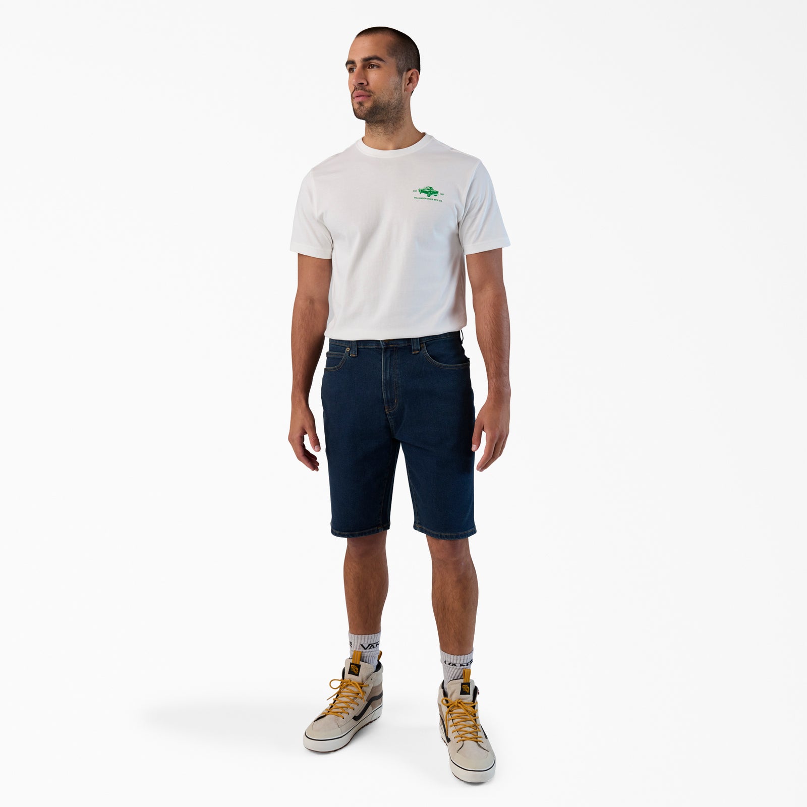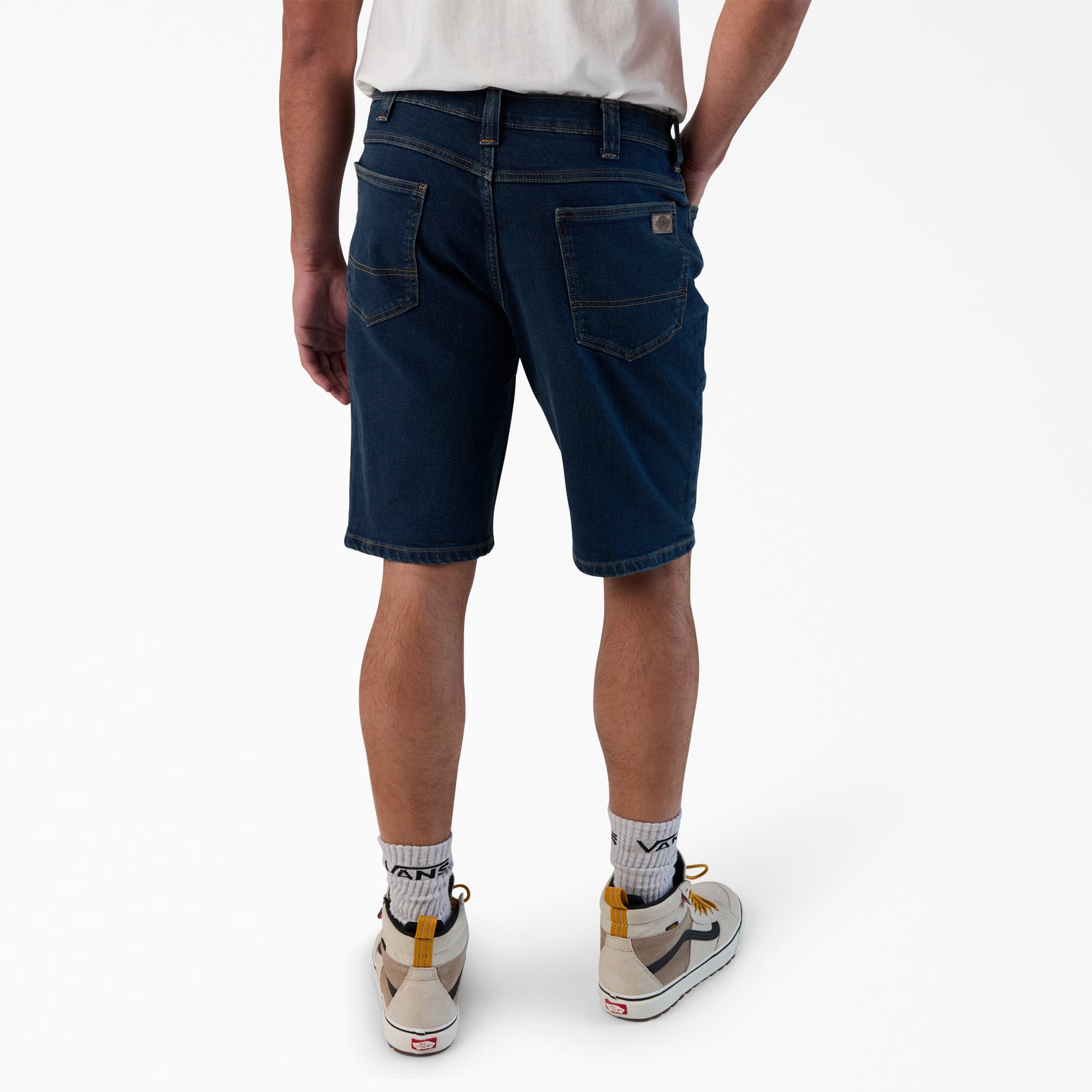 Our men’s denim shorts are a summer essential made from our Flex fabric, which is designed to stretch for comfort without sacrificing durability. The shorts have a regular fit and 11” inseam for a comfortable fit. They’re reinforced with double needle stitching and equipped with seven belt loops to evenly distribute the weight of your work belt for added support.