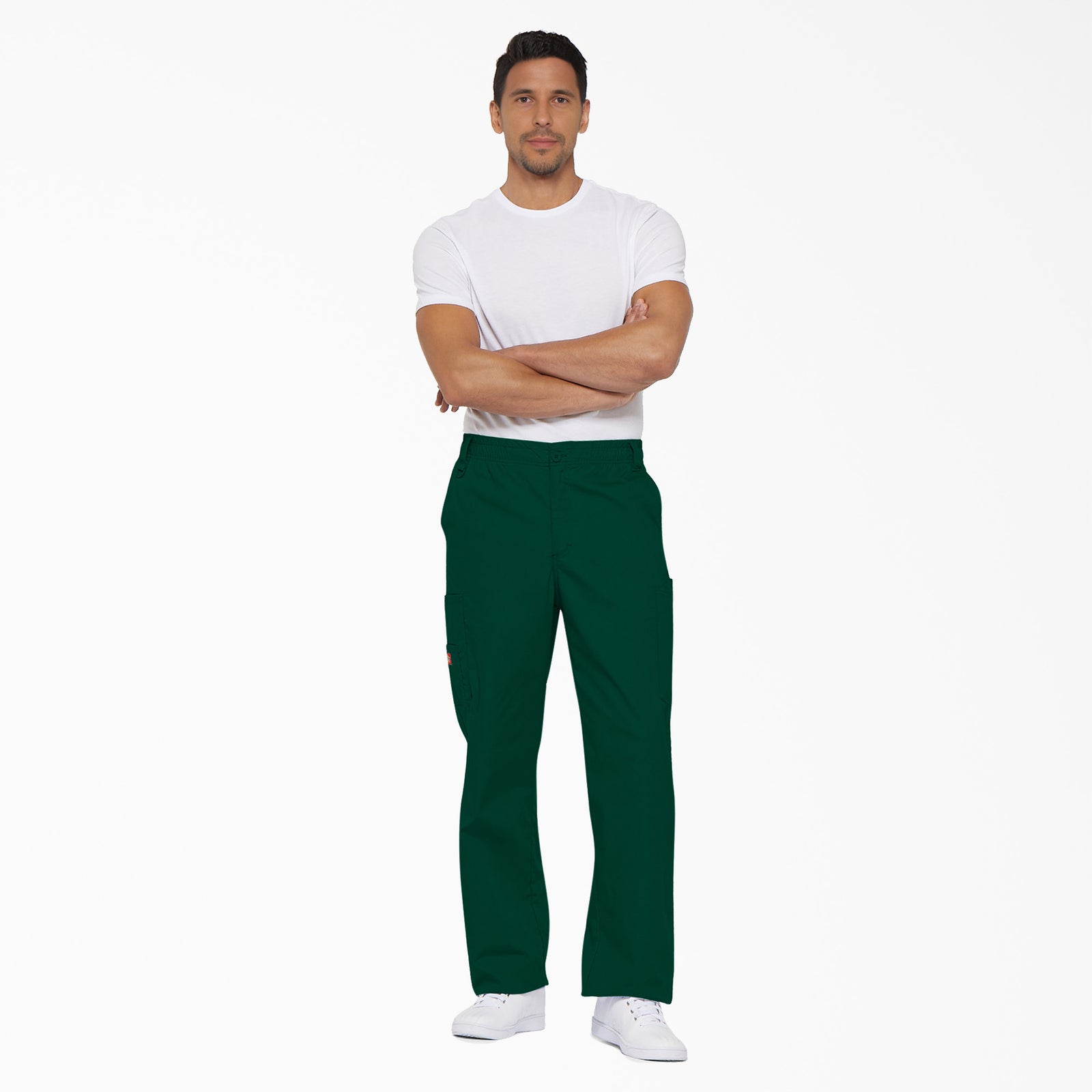 Men's Fit zip fly pull-on pant features an all-around elastic waistband with a button closure, an adjustable interior drawstring, three belt loops, and Dickies logo twill tape on the inside back waistband. There are two front angled pockets, two cargo pockets, two utility pockets, and a back pocket. Right cargo pocket and back pocket have hook-and-loop fasteners for security. A D-ring on right front belt loop and double-needle topstitching throughout complete the look.