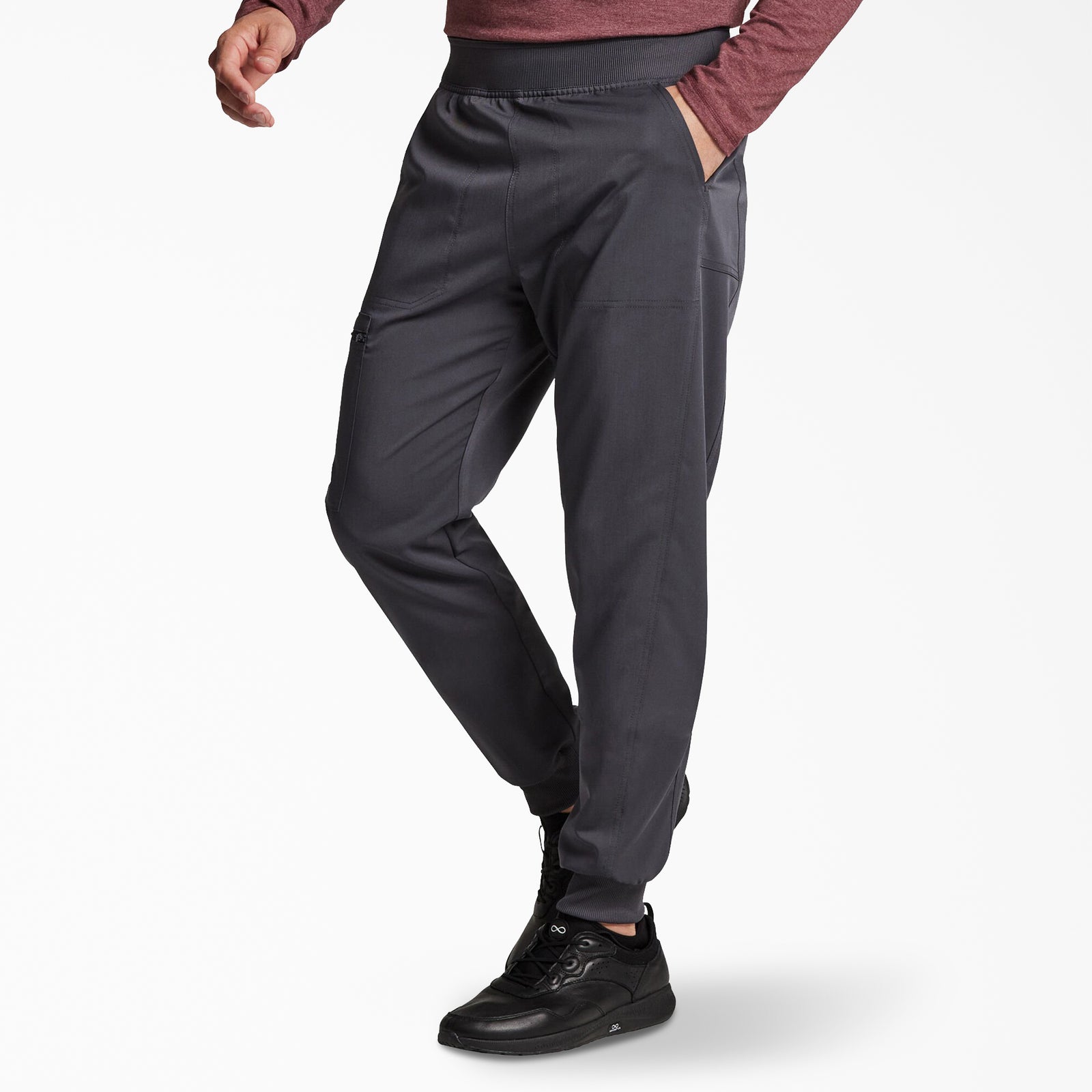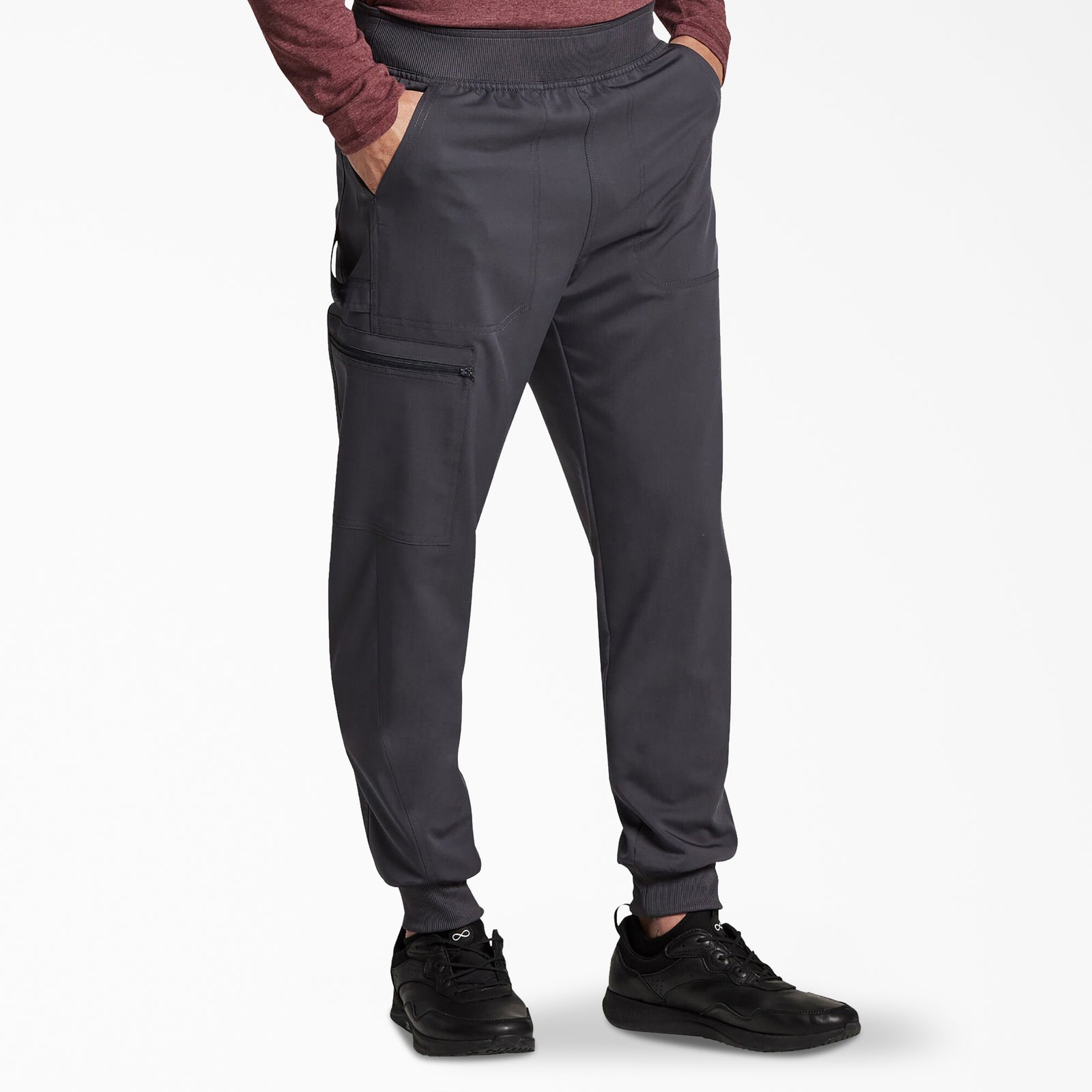 This Men's fit mid rise pull-on jogger features a rib-knit covered elastic waistband with inside drawstring. There are five pockets: two front pockets, one cell phone pocket on the wearer's left, one zip cargo pocket, and one back patch pocket. A utility loop on there wearer's right and rib-knit cuffs complete the look.