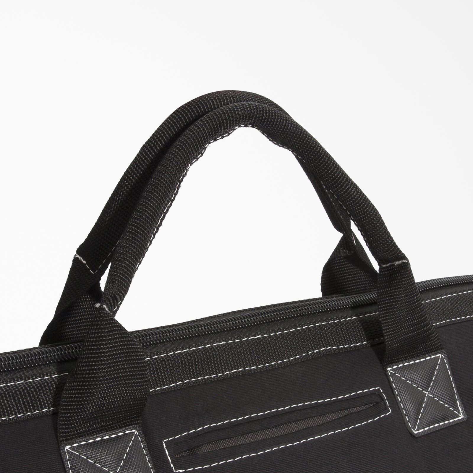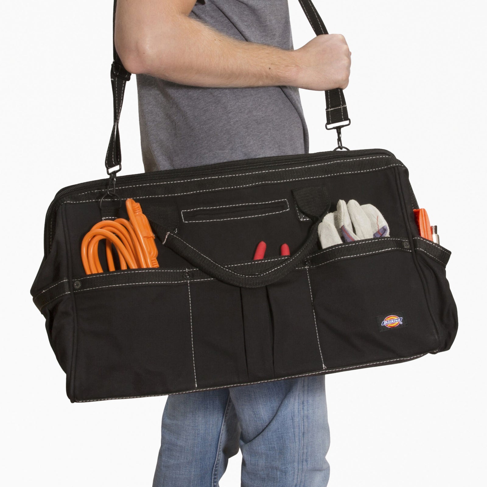 When you put the Dickies Work Gear 20-Inch Work Bag to the test, you'll never be disappointed with the results! Constructed of durable black canvas, this tool/work bag features a large main compartment with a wire-reinforced opening for easy access to your tools and accessories. Interior measures 20-inches long, 11-inches wide and 9-inches tall when zipped closed and 11.5-inches tall if the main compartment is left open to hold larger or bulkier power tools. There are 6 roomy interior pockets that can hold a variety of supplies. On the exterior, there are 7 webbing and rivet reinforced pouch pockets and a smaller accessory pocket. The heavy-duty zipper closure secures your tools in place when you're ready to pack up, and the D-ring attached padded shoulder strap is fully adjustable and allows for the easy and comfortable transport of heavier loads.