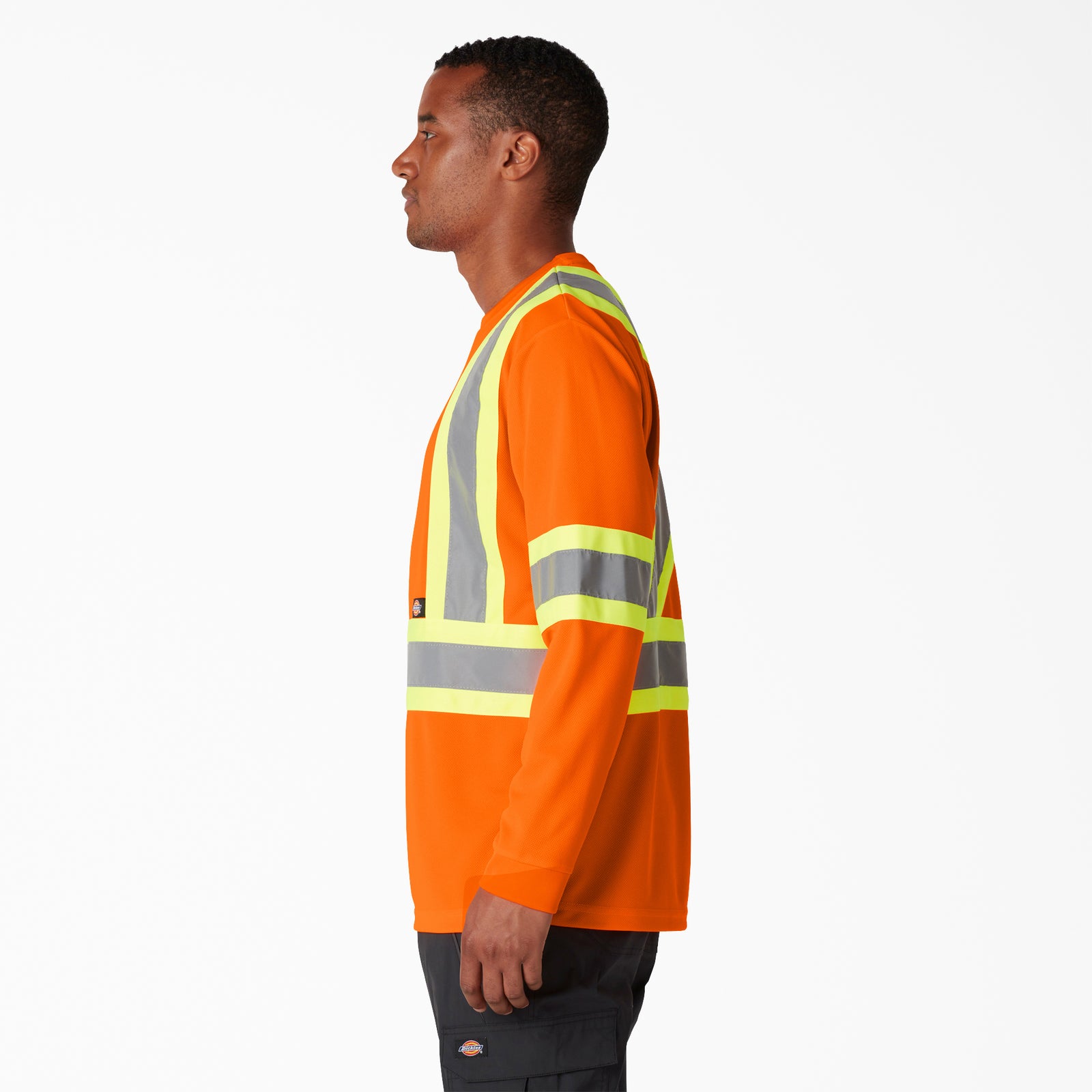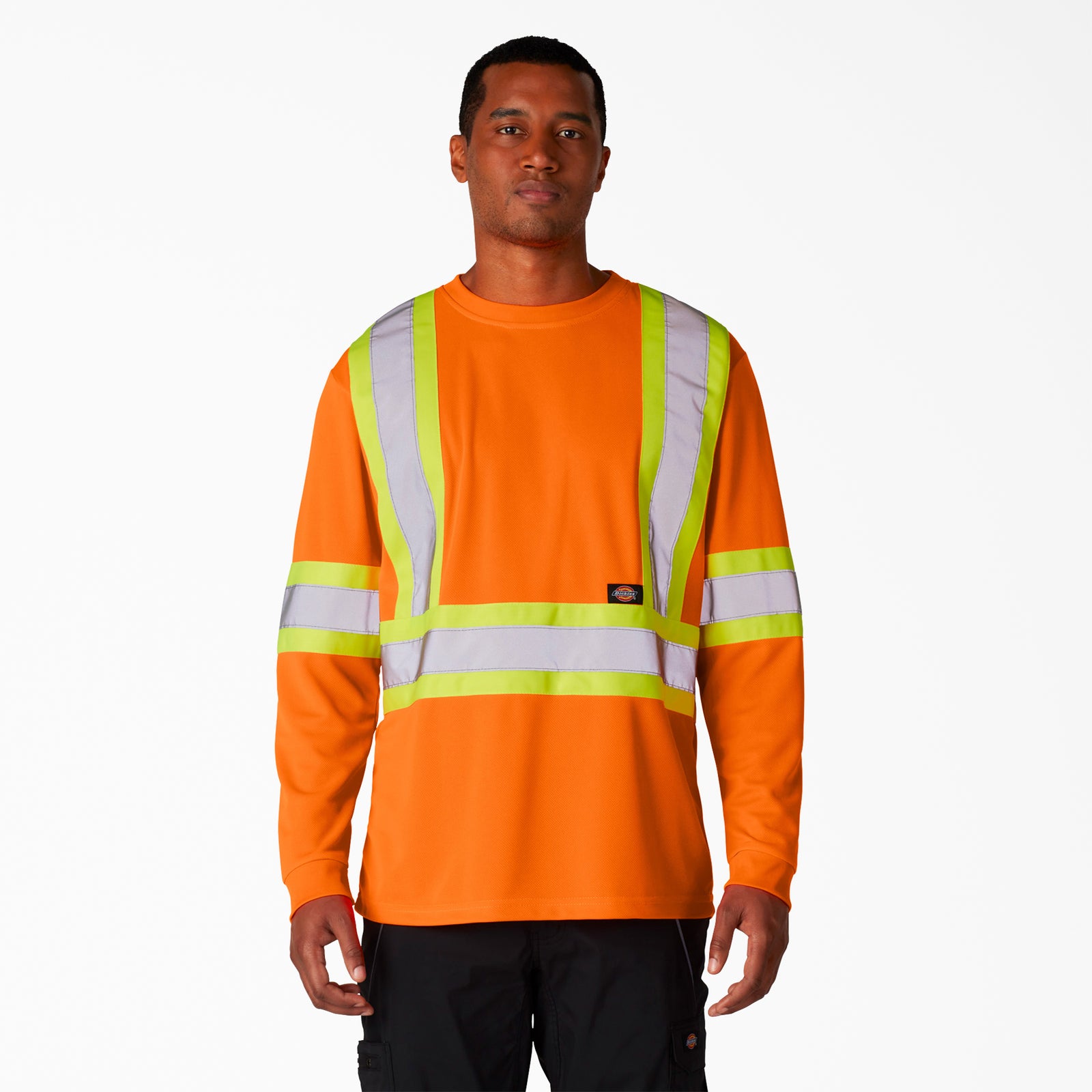 Stay visible even in the colder months with Dickies Hi Vis Long-Sleeve Safety T-Shirt. Perfect for road crews or anyone else working at night, the reflective stripes that cover the shirt help you stay visible while at work. The breathable material is made of mesh that wicks the moisture away from your body. Extra reflective stripes around the sleeves add to the safety provided by this t-shirt.