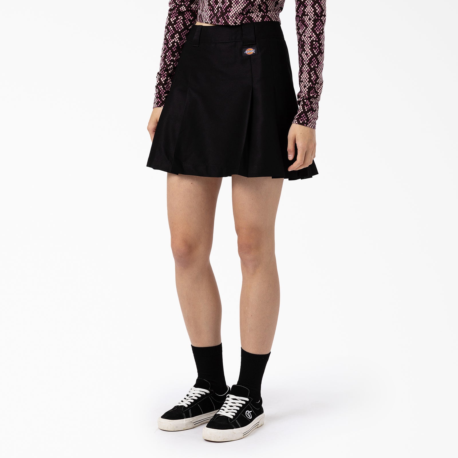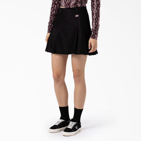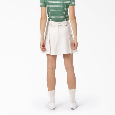The Women's Elizaville Skirt is a fitted short skirt, with a vintage sports attire style reminiscent of a preppy-style skirt. The flattering tailored skirt features knife pleats, a belt loop waist, and the iconic woven Dickies label. This high-waisted piece zips up seamlessly in the back and has an additional button closure. A simple but timeless high-waisted skirt, you can wear it on the go wherever your day takes you, and however you choose to style it.