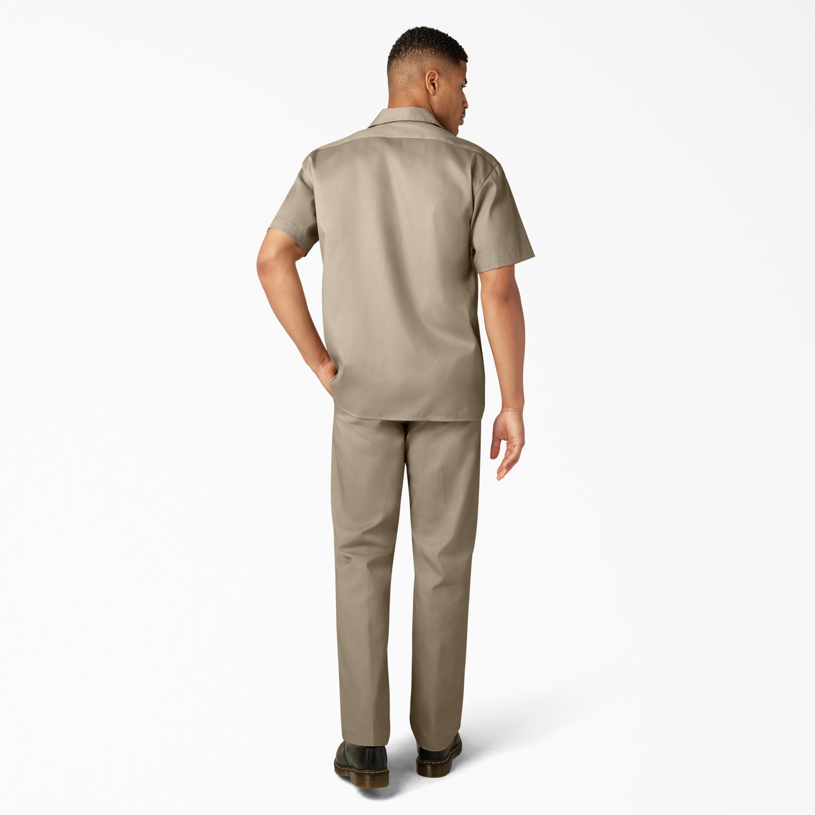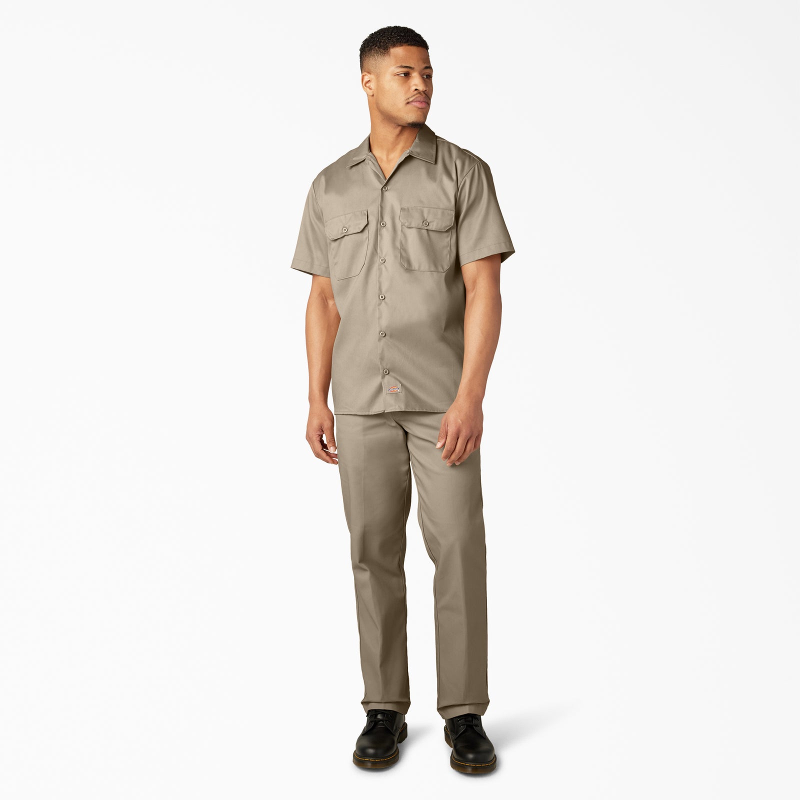 The Men's FLEX Relaxed Fit Short Sleeve Work Shirt is durable but lightweight and has a generous cut for easy movement. The comfortable FLEX technology stretches as you move, wicks away moisture to keep you dry, and has an easy-care stain release finish. The classic work shirt features dual chest flap pockets with button closures, and the left pocket even has a pencil divider for organization. A straight-hem cut means you can wear this piece tucked in or let it hang out.