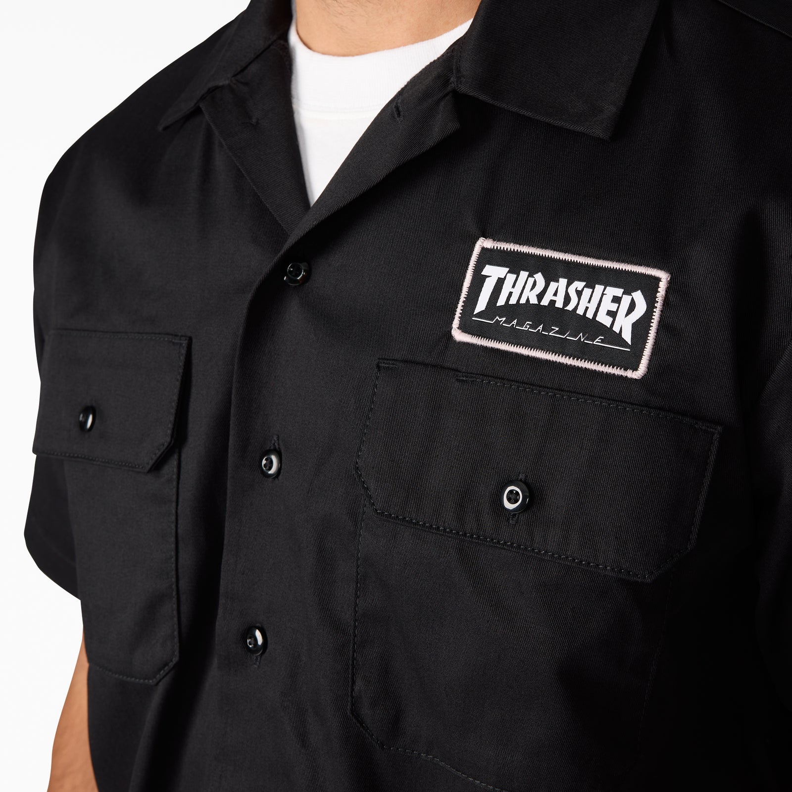 The Dickies × Thrasher Collection celebrates skateboarding culture. The work shirt is a classic workwear silhouette with secure chest pockets and durable cotton-blend twill fabric. It’s updated for the collection with a co-branded front patch and graphic across the back.