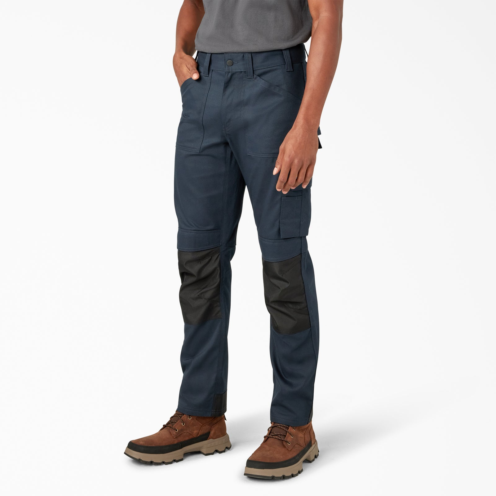 Our Men's Pocket Utility Work Pants offer a functional style that you can trust. These regular fit, straight leg pants have plenty of pockets, including front utility pockets, multiple cargo pockets, and a multi-use cell phone pocket to store your work essentials. With reinforcements on the knee and with a back hem with contrasting patches, these pants are a durable option for daily wear. A gusset panel adds mobility. Stay comfortable on the job thanks to the easy-care stain release fabric that has moisture-wicking properties to keep you cool and dry, and mechanical stretch to keep you moving freely.
