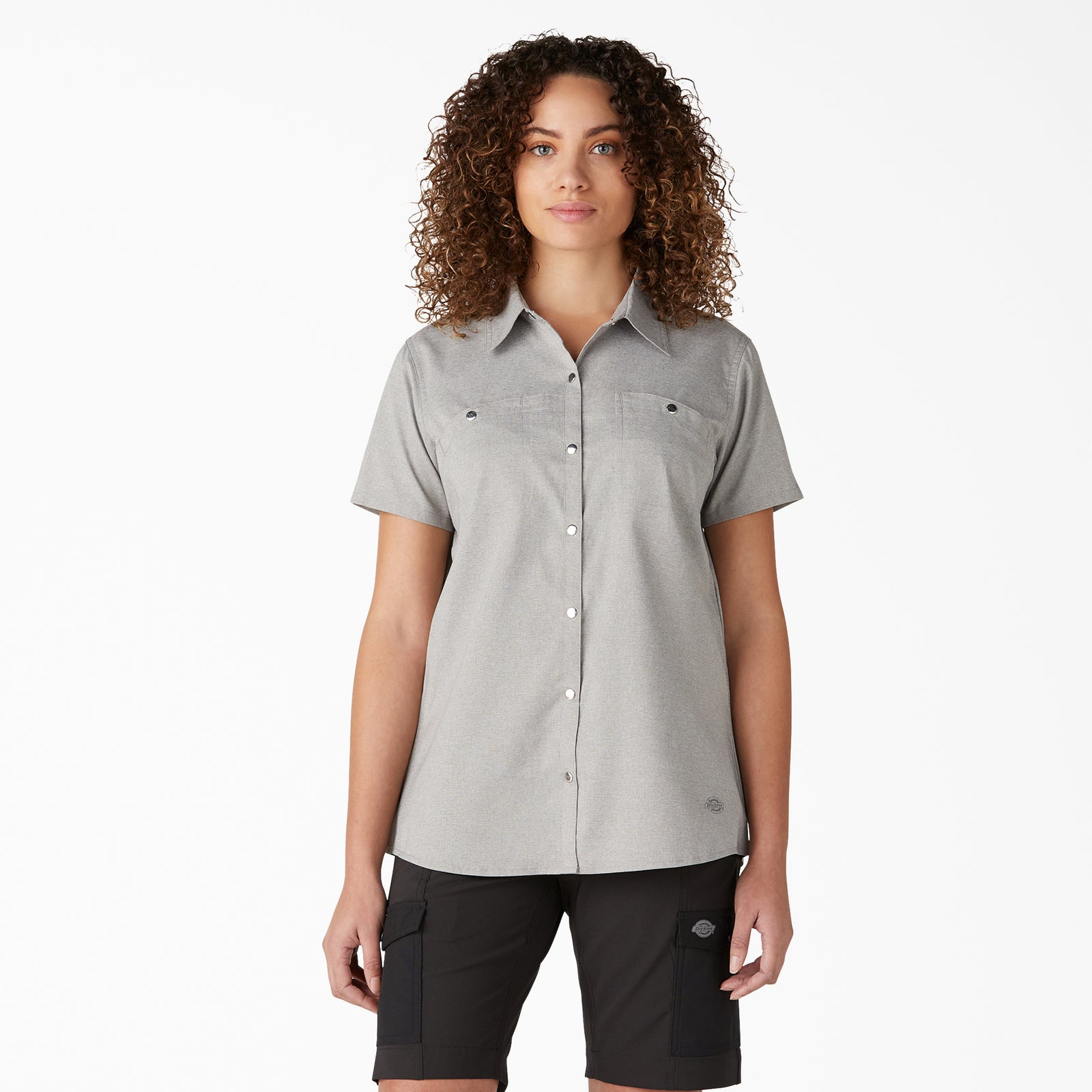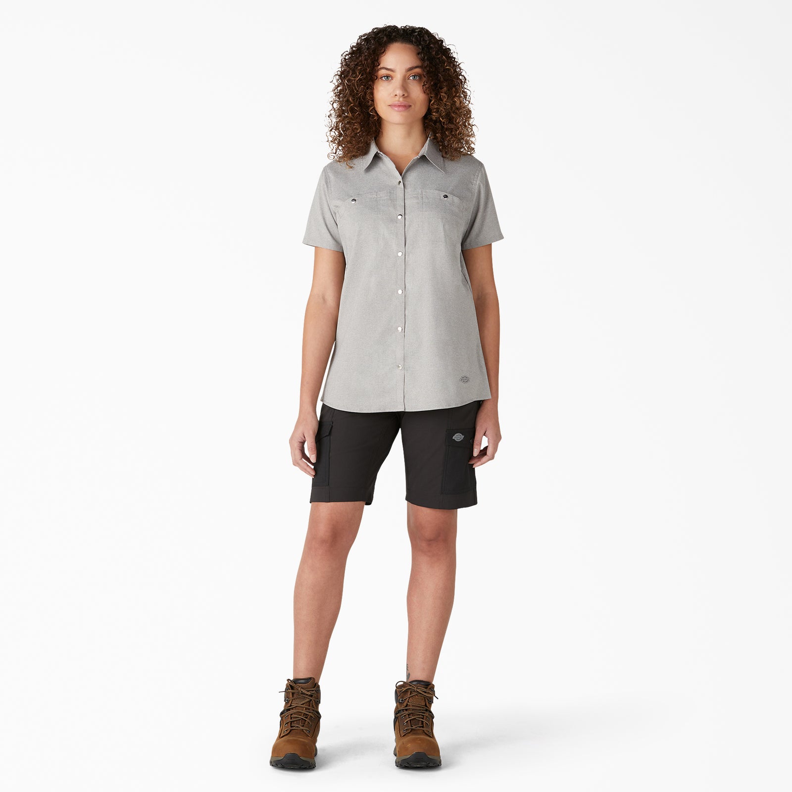 Show up and show off your signature workwear style in Dickies Women’s Temp-iQ® Short Sleeve Work Shirt. The silhouette features updated back seams that offer a slimming feminine fit. Engineered to maximize mobility with Dickies® FLEX fabrication, you will be able to move smart while looking even smarter in this purpose-built work shirt. Advanced Temp-iQ™ intelligent cooling technology detects when your core body temperature rises and releases an instant cooling sensation. The full button closure features durable metal snap buttons while the dual front snap button pockets are equipped with a mesh lining to safeguard your gear. Protection comes standard in low visibility conditions as well with Dickies’ reflective logo at the front hem, proving your appreciation for authentic workwear styling.