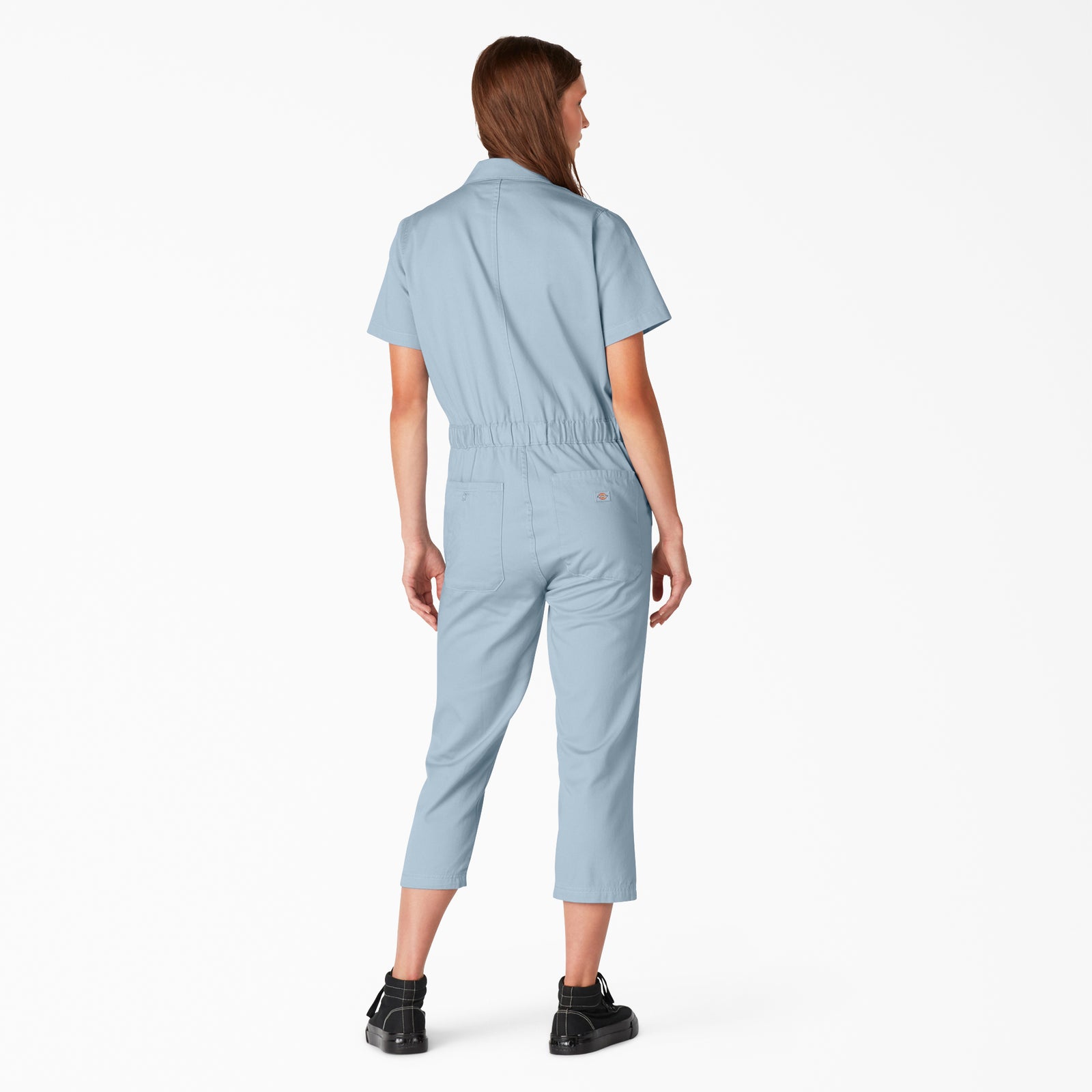 Forge your self-expression with a sustainable story this season in the Women's Reworked Coveralls. Built from recycled trim and thread and faux garment dyed to reduce water waste, these cropped length coveralls embody the attitude of Dickies Natural Reactions Collection. The fog blue hue is evocative of color naturally occurring in our environment, a mainstay of the collection. The full button front entry and elasticized back ensures a true flat front and favorable fit throughout. The front patch pocket is affixed with a clean finish right below Dickies embroidered chest logo. At rear, two additional pockets with a single Dickies tricolor logo complete the iconic design.