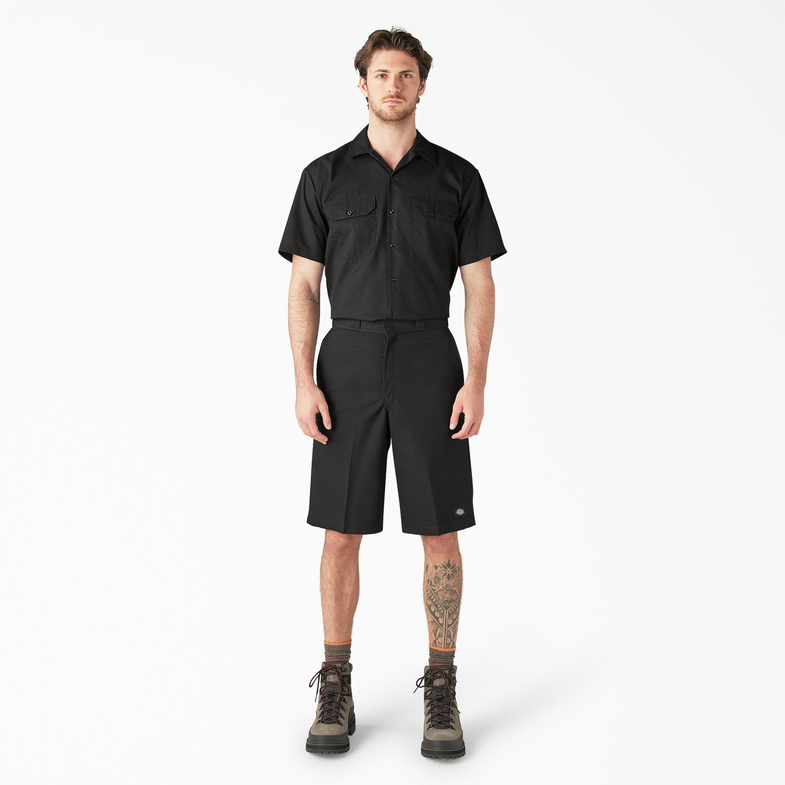 Work with a classic when you choose one of our bestsellers, Dickies Men's Loose Fit Flat Front Work Shorts, 13". Popular for a reason, these shorts combine functionality with design. They offer a longer 13" inseam and spacious fit in the seat and thigh. The wrinkle-resistant, easy-care stain release finish to protect against wear and tear from tough jobs. Signature long tunnel belt loops have got your heavy-duty tool belts covered. Back welt pockets offer flap-free access. A multi-use pocket on the right leg provides additional storage. Stay looking sharp on the job with the flat front permanent crease.